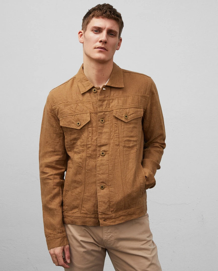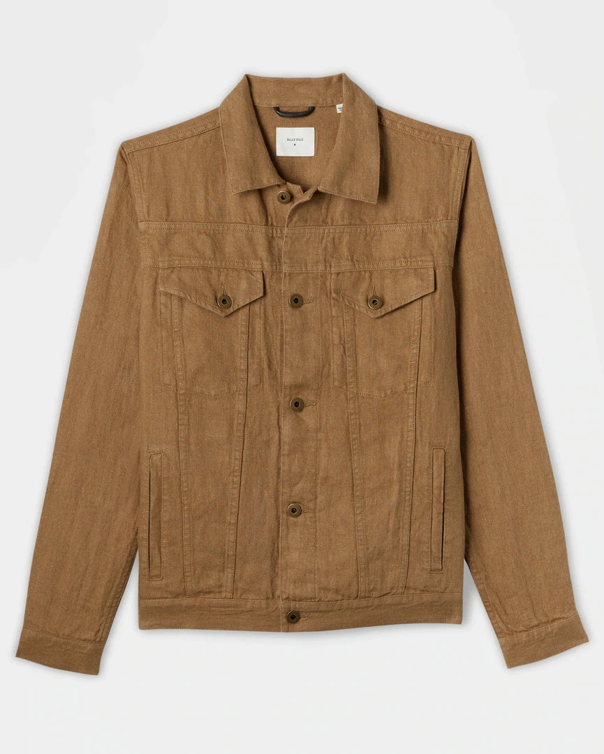 100% linen for an unexpectedly lightweight feel. Finished with antique brass buttons throughout, with those at the cuff branded with our signature ribbon stripe. An essential layer for this season and beyond.