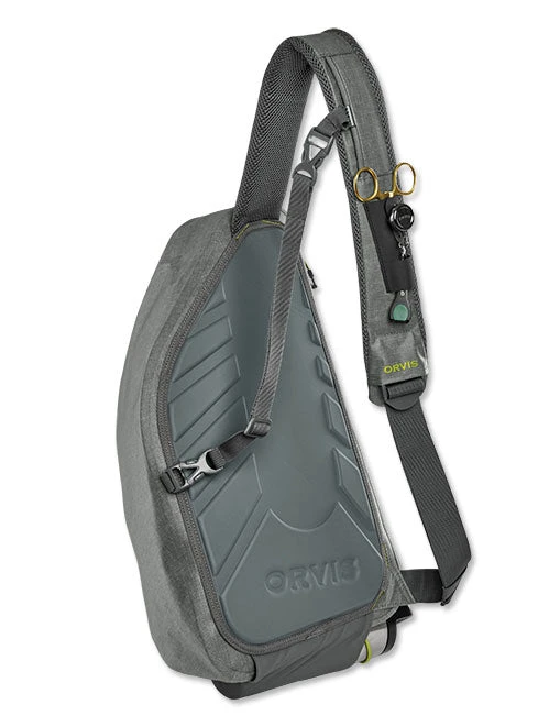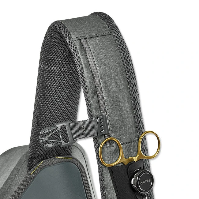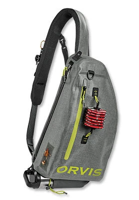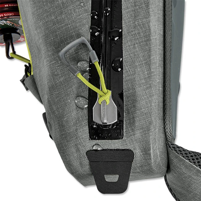 Our best-selling Sling Pack in a new and updated Orvis waterproof version. Keeps your gear out of the way, but instantly accessible. Waterproof and impervious to weather, deep wading, or an accidental dunking. TPU coated 500D nylon. Main compartment features waterproof YKK® Flexseal zipper. Secondary pocket has water-resistant Ries® zipper. One large main compartment with interior pockets for ample storage and organization. Padded and adjustable shoulder strap with gear station and forcep pocket. Tippet bar loops, compatible with Orvis Tippet Bar (2ANB). Internal hook-and-loop strip to attach Waterproof Pocket (8G3H). External fly-drying patch included. D-ring for landing net. Water bottle pocket with elastic security cord. Messenger strap to secure bag from swinging around. Water-resistant back panel with embossed channels for ventilation. In gray. TPU coated 500D nylon. Imported.